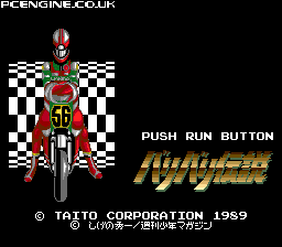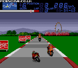 Based on a manga, Bari Bari Densetsu is something of a rare breed on the Engine - a motorcycle racing game. You can pretty much guess how it works - there's a World GP mode where you have to compete in a variety of races in order and a Travel mode that let's you pick a track of your choice. Also to consider is the gubbins that make up your bike, such as tyres, engine, brakes etc as these have an effect depending on the type of course and the weather conditions. Races are started with a qualifying lap that lets you get the feel of the track, followed by the race proper. You are then placed and can hopefully move on to the next country.