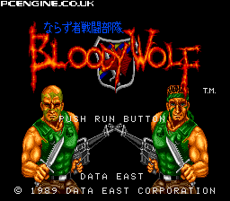 You say... Bloody Wolf is a great little run and gun that always used to be one of the more popular games on the system back in the day, but you don't hear too much about these days. It's an arcade conversion, and a very good one, coming out in the first year of the TurboGrafx. You get to choose between two visually disparate but otherwise identical soldiers, but the 2 player option of the arcade is missing.