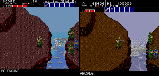 I like the fact that they don't phone this in, there's a lot of variety in the game that you wouldn't have found at the time. There are helicopters to fight, you get to steal motorbikes, and there are some good set pieces. You even rescue hostages, a-la Rambo (in fact the game is pretty much a pastiche of 80's action films and a bit of Metal Gear). This is the kind of game that's just fun to play, and you can come back to it for some mindless badassery time and again. That said, the continues on the TG-16 version are infinite, which is a bit of a mixed blessing. You'll complete it just by sheer number of attempts, but you won't have the same accomplishment unless you ration out the continues yourself. That's not to say it's easy though, there are definite hard parts that will frustrate you. soop