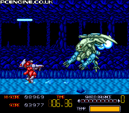 Browning is a side scrolling action game that puts the player in a power suit and pits them against hordes of miscellaneous mecha with some very big guns. You walk and shoot, run and shoot and also fly and shoot, although flight time is limited due to the useless engineers failing to fit a large enough fan in your jetpack. After ploughing through a few screens of nasties, you are presented with a particularly unfriendly boss mecha who seems intent on aggressive negotiations. After quickly dispatching said boss, you are free to move on to the next level and do it all over again!