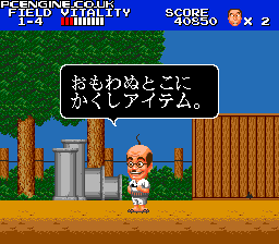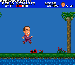 Overview Based on a popular comedy duo, Hudson has taken the gameplay from the original Wonderboy and transplanted it with a dash of toilet humour. Many key elements from Wonderboy are here...your ever decreasing health bar (topped up by fruit), the method to jump higher by holding down the attack button, but there are a few differences. Attacks are made in several ways; first by a simple kick (short range and difficult to judge), second by a powerful bottom burp (but remember to turn around before letting one rip) and if those are too much, just jump on the enemies heads in a Mario style. Throughout the landscapes are many objects to be kicked, some gain you coins, some fruit, others open up bonus areas (like the Wonderboy-style bonus level in the clouds). Also, kicking a doorway will open it, allowing you to venture inside to either full health and tips from your partner (usually in some crazy disguise) or a fruit machine where you can gamble collected coins to gain goodies. And speaking of your partner, look out for him along the way, often making a nuisance of himself by throwing cans at you or taking a dump behind bushes.