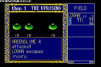 Overview An overhead, random battle, fantasy role-playing game, Dragon Slayer - The Legend of Heroes comes from Falcom, the company behind the Ys series. All the genre staples are here: a group of up to four characters, weapon and item shops...you know the drill by now. Battles are random and turn based, with the option of using either CD music or PSG which avoids that little extra CD access time (this also applies to village tunes). Later in the game, you are able to see the creatures moving about the landscape, making avoiding battles that much easier if you are just trying to get from A to B without hassle. The plot is hardly anything original, involving the player taking the role of the young prince escaping from his evil guardian and adventuring into the dangerous world outside. The storyline does however develop into something much wider and more dramatic as the game progresses, and is split into several chapters to help mark your progress.