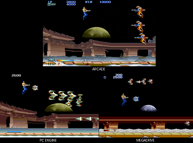 Overview Capcom’s horizontally scrolling blaster has you take control of a flying warrior with a Space Harrier style jet-gun thing. Your journey takes you through strange landscapes, from ruined cities to Egyptian tombs. As you fly around, you control shot direction by rotating left or right, allowing you to a 360 degree range of fire. You also have a handy satellite that follows you around, adding to your firepower. This, among other things, can be upgraded in a shop where you can spend all that zenny you have been collecting from your kills. Shops pop up at specific points in each level, so be sure to have enough cash for your gear, armour or health potions.