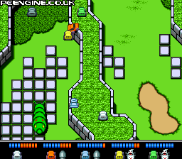 This cute overhead racing game allows you to play with up to 5 players all at once (using the multi-tap). The object is to race up the varied, auto-scrolling courses, avoiding all manner of weird objects like dung beetles, naked bathing girlies, giant robots, Rambo clones...you get the idea. At the end of each race points are awarded for your finishing position and these can be spent on upgrading your car with a choice of weapons to use against your opponents.