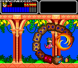 Feeling more like the first Wonder Boy than the second, Monster Lair is a fast-paced auto scrolling platform game. The levels are split into two stages, the first being a platform stage, the second a shoot 'em up stage which ends in a boss. During the game your energy counts down, so you must keep picking up fruit to replenish yourself. There are a variety of weapons to collect - lasers, spread shots, spinning shields and so on, but these are also on a timer and do not last long, so weapon switching is frequent to avoid being left with your basic short range sword shot. The game is single or two player simultaneous.