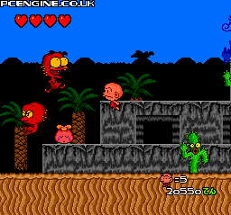 Overview Mario has his jumping, Sonic has his speed, but PC Genjin has his head-butt! On a journey through prehistoric lands, this is your main defense against the crazed dinosaurs out to get you. But it's not your only defense, as now and again you will come across huge chunks of meat that grant you increased powers - from the ability to freeze all enemies by head-butting the ground, to a limited period of invincibility - complete with wacky music. Your cranial skills also come in handy when you are required to jump a long distance, as hitting the attack button as fast as you can will make you somersault in mid-air and increase your jumping range. On your way, you will come across several different types of plant. Yellow ones act as a sort of springboard, and red ones spit out fruit - be careful though as some will transform into an evil plant and come hopping after you. Also, points can be gained by keeping enemies in the air by repeatedly head-butting them - something to remember as points mean lives.