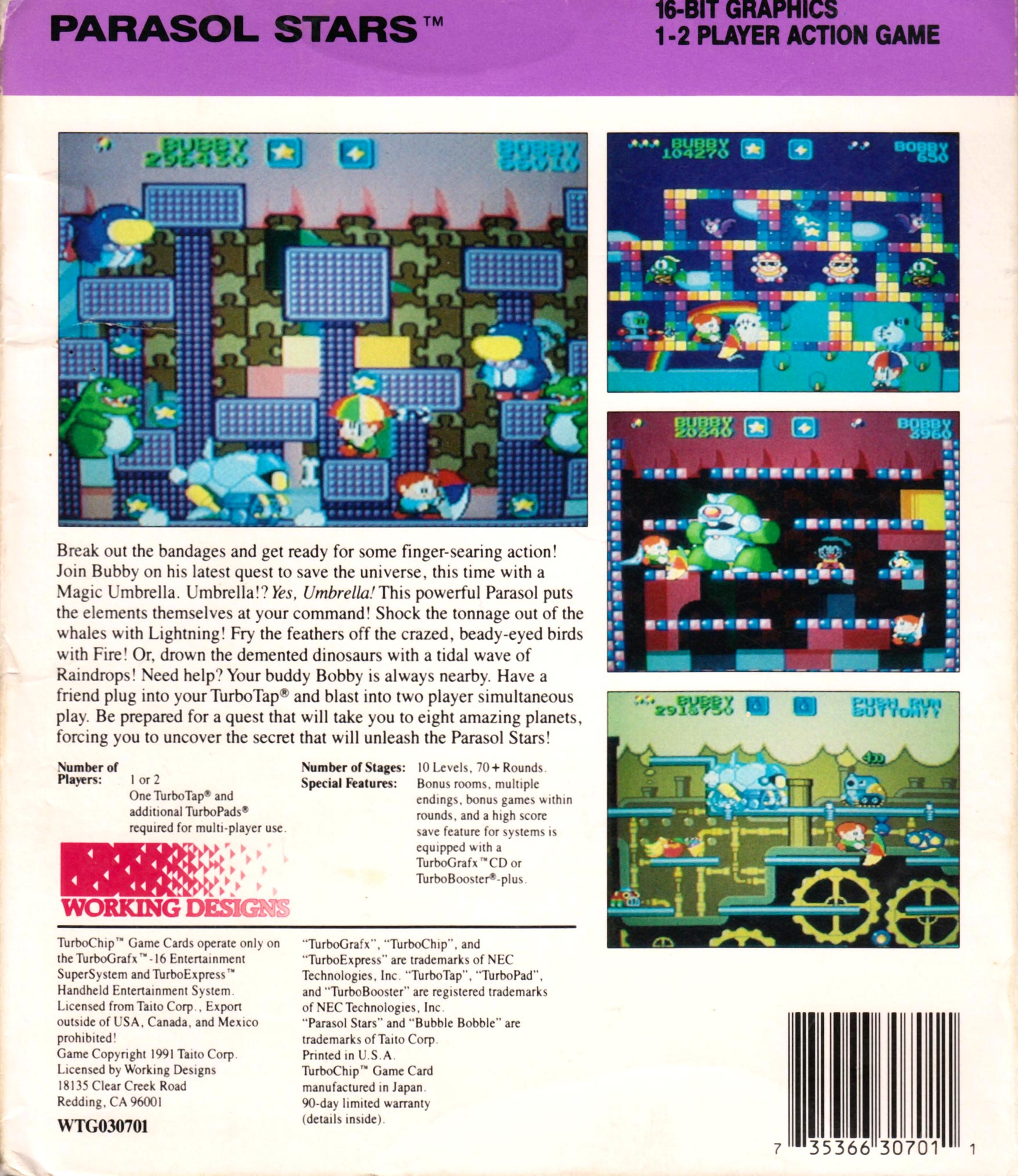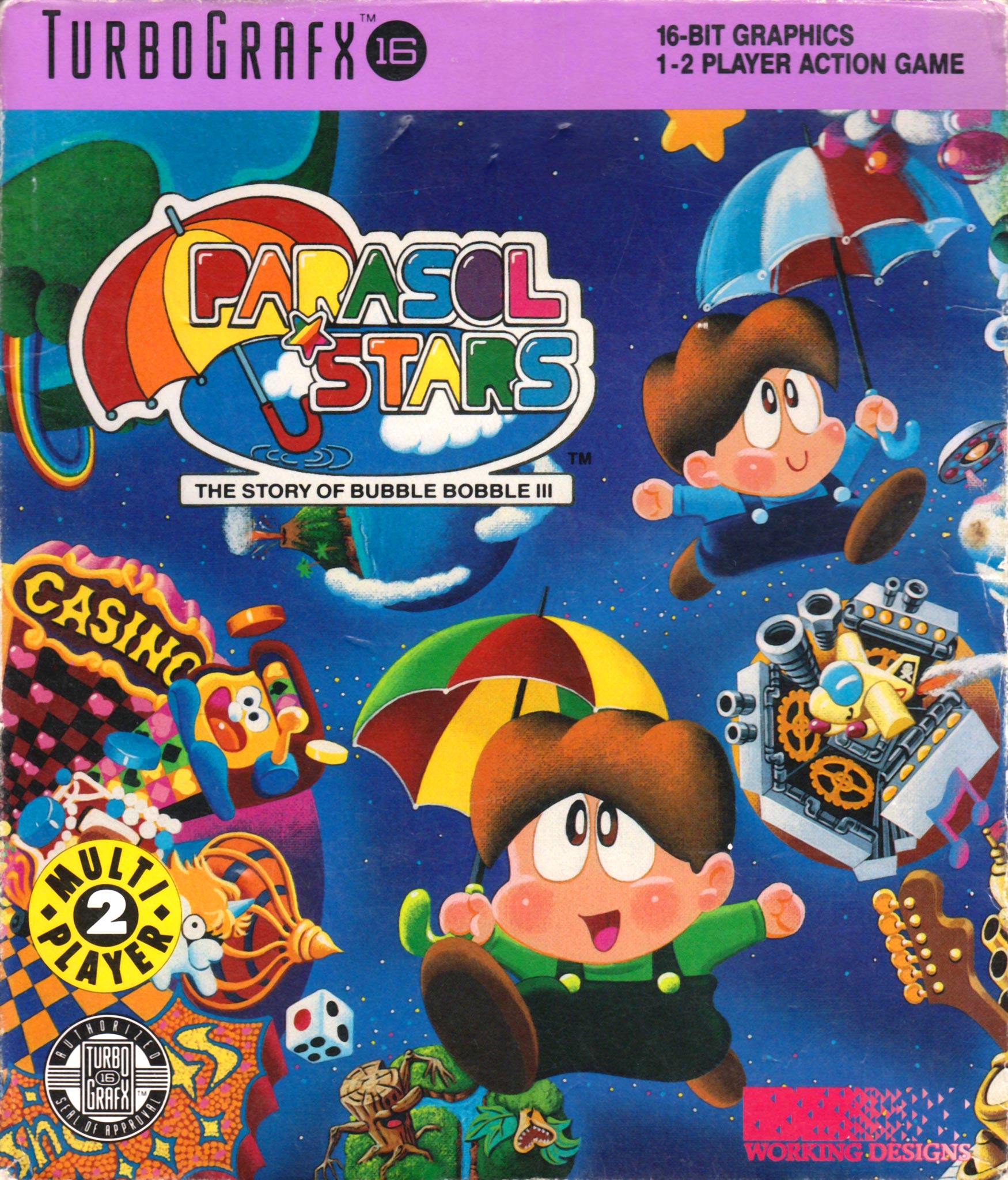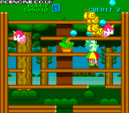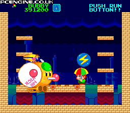 Third in the Bubble Bobble series created specifically for the PC Engine, you must clear each level of enemies by using your umbrella to throw them, or catch water or lightning droplets and toss them across the screen.