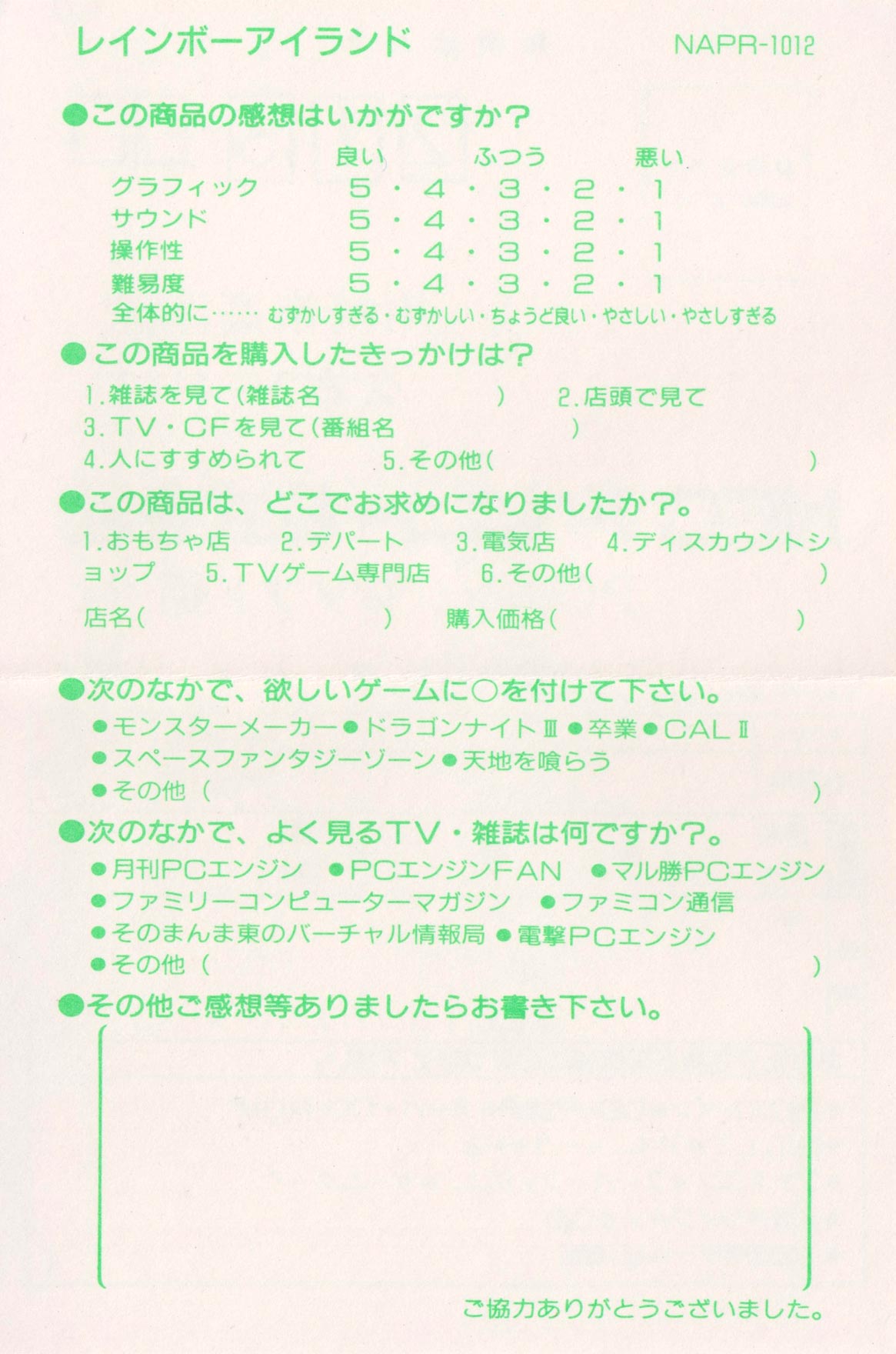 And that would be it, but this is the sequel to Bubble Bobble, and therefore, this game is absolutely rammed with secrets. You see, there are multiple endings to the game. If you crush a rainbow over an enemy, a gem will be thrown out on the screen, in a different colour depending on where it lands (I think). If you collect 7 different coloured gems on the same island, a giant gem will appear, and collecting all seven of these will cause three more islands to ride from the sea, and enable you to obtain the true ending. The PC Engine is rare, in that it was the only release until I think PS2 that even had these extra three islands. Moreover, if you collected the coloured gems in the correct (rainbow) order on each island, a door will appear giving you access to a permanent, death-proof power up.
