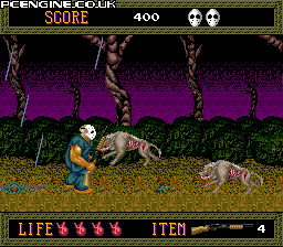 Cleavers, rocks, wrenches, 2x4’s, spears and shotguns can be found to give Rick aid in rendering the hordes of evil into stew while he traverses the seven sometimes branching stages of Hell.
