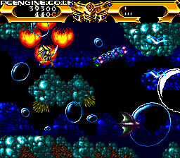 Winds of Thunder is widely regarded as one of the finest shooters on the system. It's not a space shooter, but more of a fantasy setting, similar to something like Gynoug. It features impressive, colourful graphics and a banging, much lauded rock soundtrack. You're flying around dispatching fantastic monsters, using a magical suit of armour based on one of the 4 elements. This is something that differs from a lot of other shooters of the time (although later simulated by a choice of ship for example), in that you can't change your loadout mid-level by collecting different colour powerups. There's an impressive intro too, even if I don't understand it. It also has a shop at the beginning of each stage, which I absolutely love in games. The level design is interesting. It's not afraid to move you in a direction apart from left to right, snaking you underground at times. The spritework is usualy good, and occasionally fantastic, especially the larger bosses. The weapon loadouts are interesting too, each having an intended "best-fit" it would seem for a particular level. And lastly, the music is incredible, if not something I'd listen to in isolation.