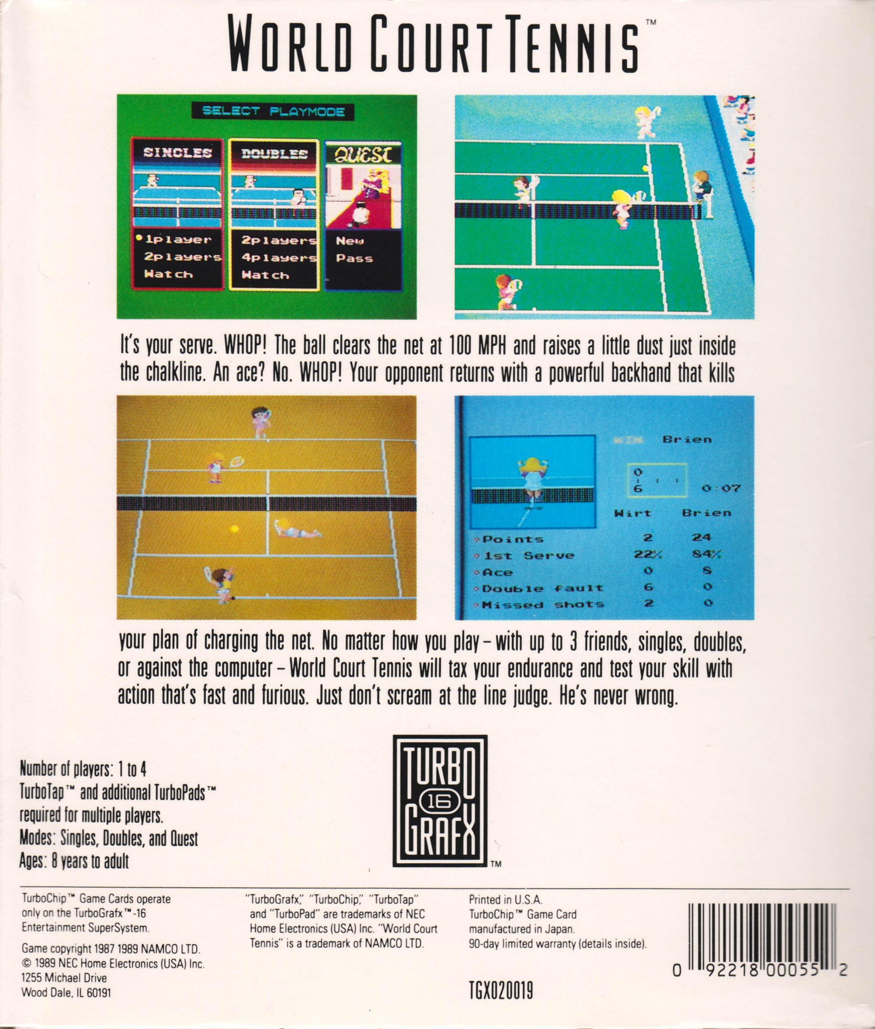 The quirk of a fantasy RPG/sports crossover is the only thing that makes this game at all worth playing today, and this Quest Mode is shallow and feels unfinished. For instance, even after beating the game I never successfully used the menu’s “Search” function and never knew what to make of the “Poop” item in my inventory. The tennis gameplay is too simple to stand on its own for long the RPG is only a fun idea that’s very thinly executed. Funnily, in the ending dialogue the now-restored good guy tennis king congratulates you on saving the world and suggests that you may also enjoy Final Lap Twin, a Namco racing game which employed the same RPG Quest Mode gimmick.
