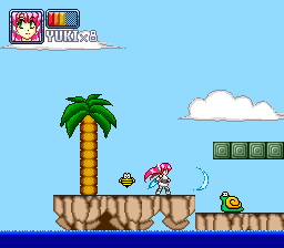 Yuki is a young girl that gets sucked inside a digital world and has to survive through a series of levels based on existing games. The gameplay is primarily a side-on platformer, with the ability to attack with a plasma slash as well as charge up your shot Schbibin Man style. There are also horizontally scrolling shoot 'em up style stages interspersed here and there. New abilities are obtained as you progress, such as a double jump and power slide and the game contains a selection of difficulty levels.