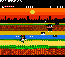 Kamen Victor: a fast-paced rollercoaster of a game not seen since the days of the Vic 20. This little beauty has you running left to right, punching and kicking the enemies as they leap at you, throwing shurikens. You don't even have to push a button to attack, your fist or foot is always sticking out so all you need to do is make contact from the front. Once you defeat the required number of enemies (shown top right - any you miss are added again to the counter) then you reach the boss stage. Here you have to push the buttons as displayed on screen to transform and take him down for good. As you can see from the video, I'm a bit rubbish. It's very, very basic, but on the upside, it does have more parallax scrolling that CD Denjin. So take that Hudson Soft.