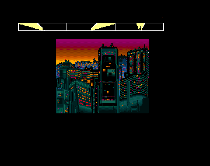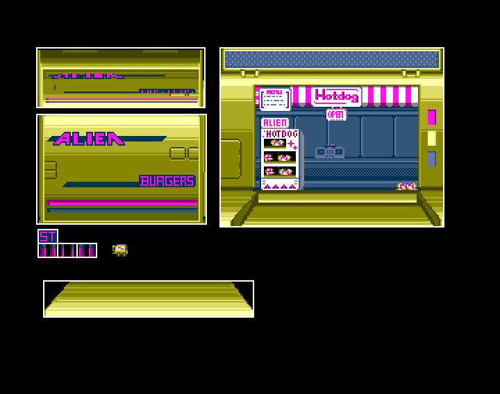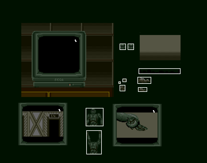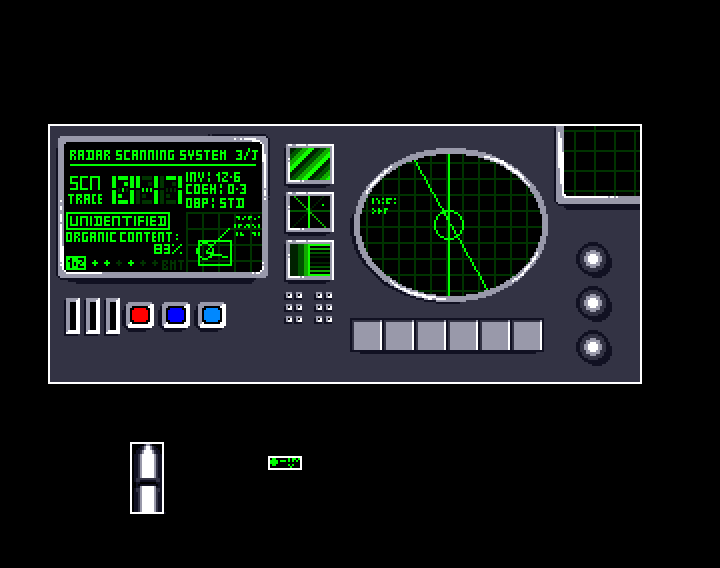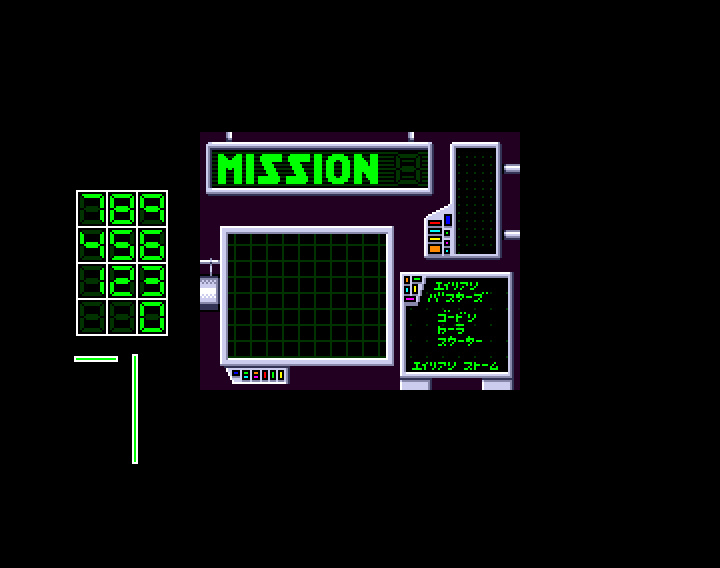 A mission screen. The plan was to have a display that showed the outline of an alien or boss, but we abandoned this.