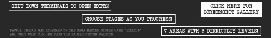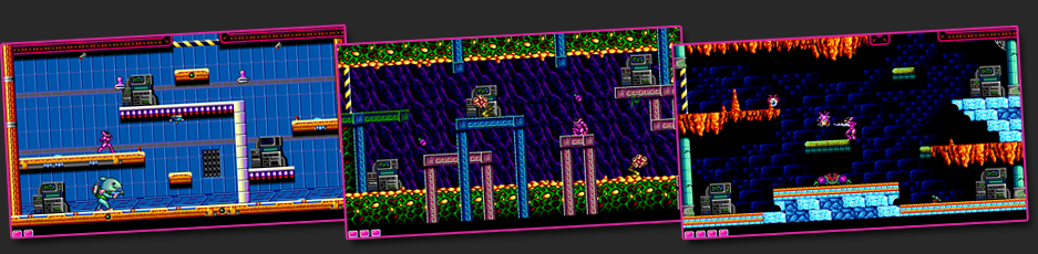 On the map screen, the player can choose either one of two stages. Once both stages are complete, you can progress to the next area. In each stage you will encounter locked doors. These are opened by accessing the security terminals. Push UP in front of a terminal to hack it. Each of three terminals must be hacked to progress. There is a master door leading to the main terminal, which can be opened by collecting a RED PASSCARD and a BLUE PASSCARD that are somewhere in each stage. Once you reach the main terminal, jump on to the platform to disable it and finish the stage.