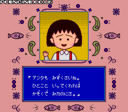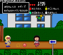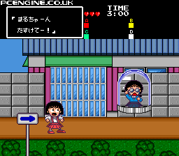 Popular children's character Chibi Maruko-chan makes her way onto the PC Engine with this cleverly presented action/quiz game. Choose your difficulty and set off down the street...but beware as there are birds, cats and nasty robots intent on zapping you. You have as defense your explorer's helmet, and magical stars shoot out of it to dispatch the baddies (jumping on their heads for a quick escape is also an option if you need to). While all this is going on, you are presented with a series of questions at the top of the screen. You have a choice of answers from A-D and to make a selection you have to pick up the corresponding letter from a defeated enemy. Get three wrong and you're out.