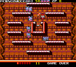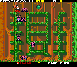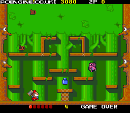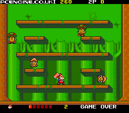 Very much in the mould of Bubble Bobble, Don Doko Don features a couple of what look like garden gnomes wielding hammers to club their enemies into submission. Once you stun a baddie, walk into them to pick them up. You can then toss them across the screen (into other baddies to dispatch them also) to destroy them and create some bonus fruit or sweeties. Clear a screen of the allocated number and it's on to the next one, leading up to a boss at the end of the section.