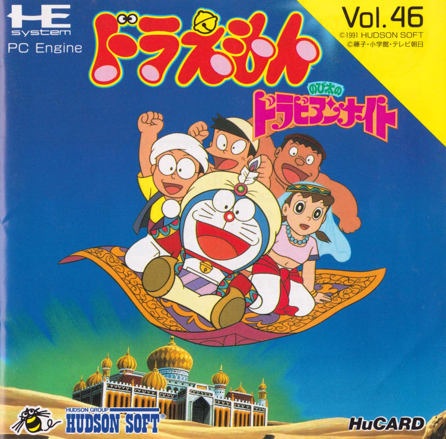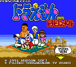 Taking a different route to its maze-based predecessor, this Doraemon game is a side scrolling platformer with a simple, colourful look. You have to rescue your friends who have dived into various books and are pursued by the inhabitants within. You start off having to avoid the wandering beasties, but eventually get hold of such items as a gun that freezes anything in your path for a moment. Along the way you get to ride on dinosaurs, crawl under moving stone blocks, creep along precarious ledges and slide down water chutes.