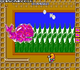 Cutesy platformer in which you play Tiki the Kiwi, out to rescue your kiwi friends from the nasty animals that have taken them captive. The platforming action requires you to navigate through sets of levels to reach your goals armed with a long-range bow and arrow to defend yourself. You can gain various upgrade items along the way such as a laser gun, fast running shoes and plenty of floating transport like hot air balloons or inflatable ducks to ride around on. But take care as these pop easily, and you yourself can only take a single hit before expiring.