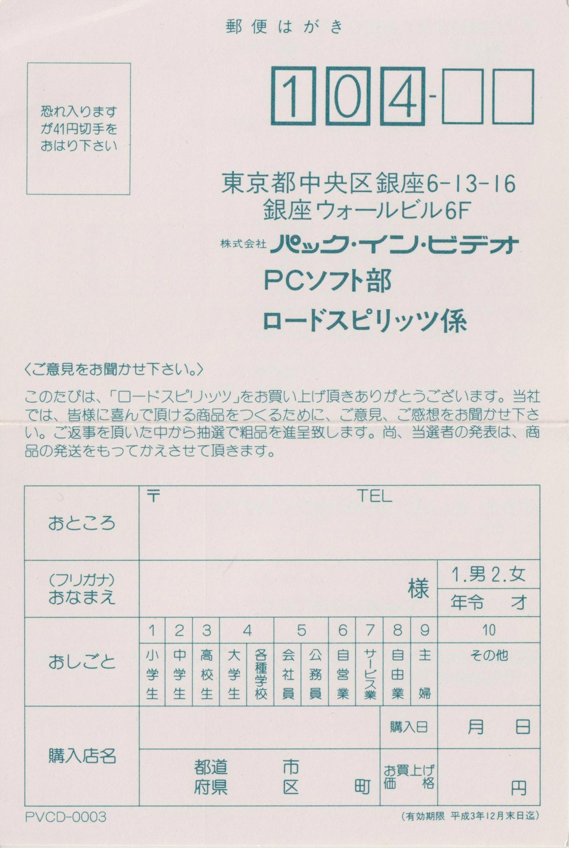 ROAD SPIRITS ロードスピリッツ MAKER: PACK IN VIDEO RELEASE DATE: 22 MARCH 1991 STYLE: DRIVING FORMAT: CD-ROM RATING: UNRATED