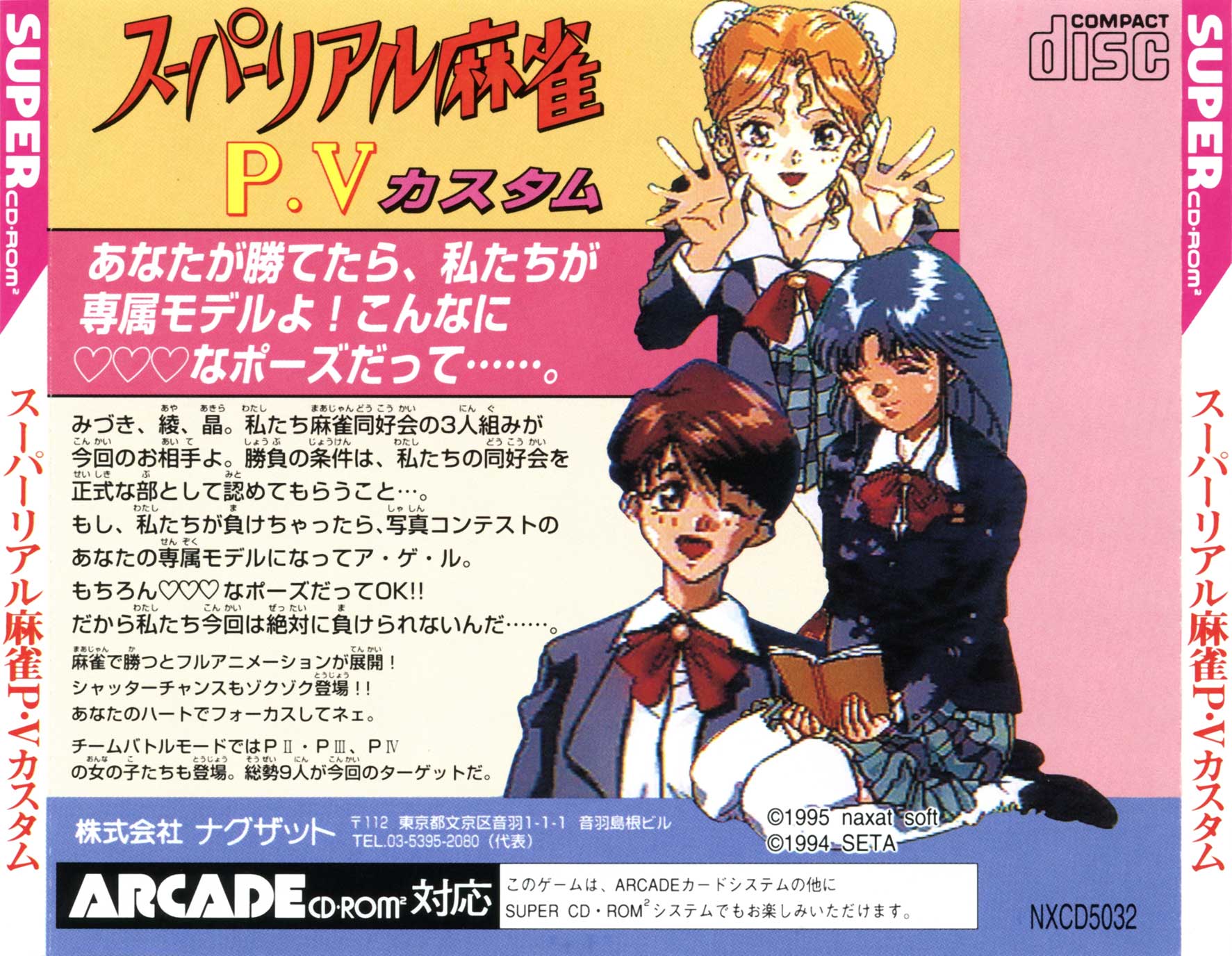 SUPER REAL MAHJONG P V CUSTOM スーパー リアル麻雀P. V カスタム MAKER: NAXAT / SETA RELEASE DATE: 3 MARCH 1995 STYLE: MAHJONG FORMAT: SUPER CD-ROM / ARCADE CARD CD-ROM RATING: UNRATED